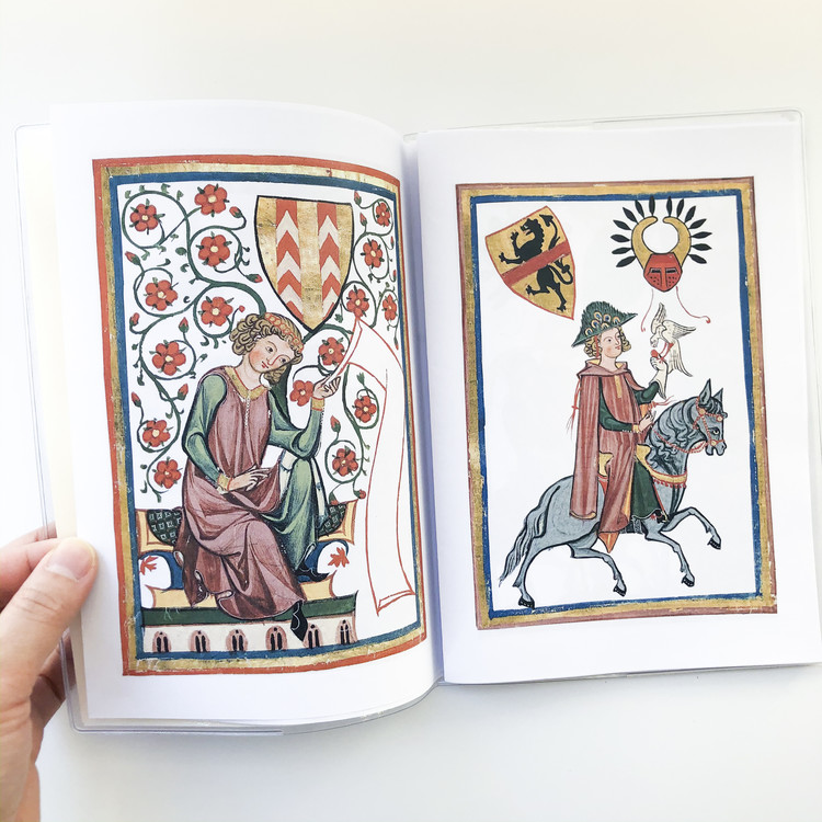 이 책은, 1888년 이래로 하이델베르크 대학 도서관에 보관되고 있는 시 모음집인 <Codex Manesse>에 나오는 그림들을 일부 복간한 작업입니다. 책을 소개하는 내용이 담긴 페이지(불어)가 함께 포함되어 있습니다.