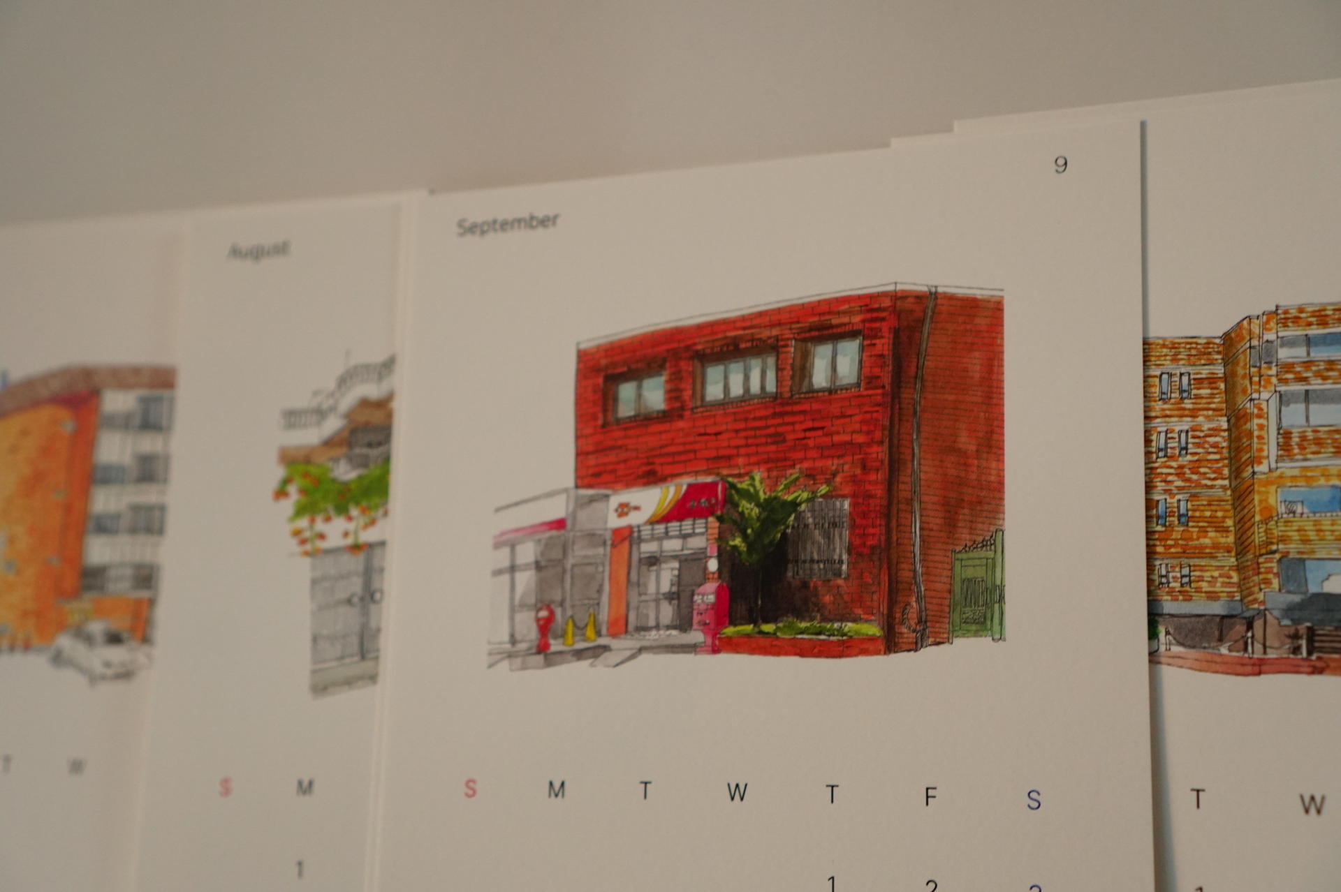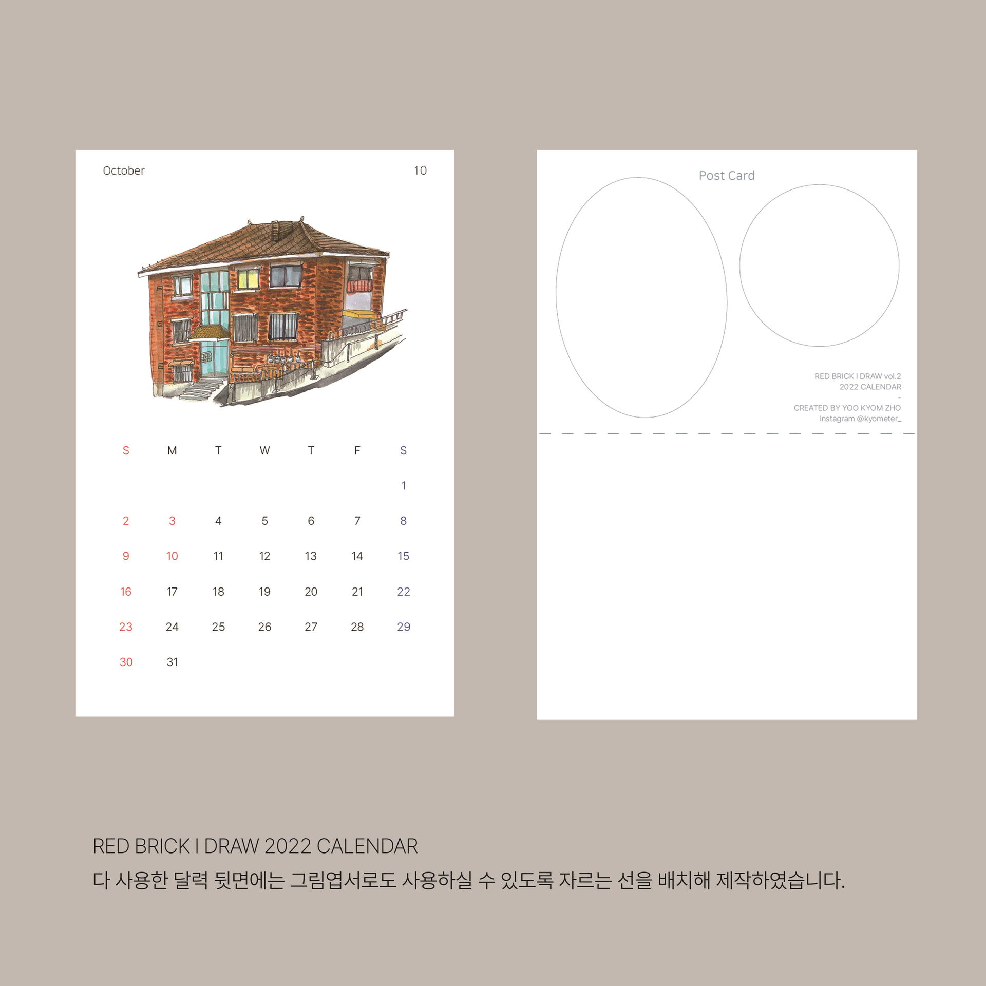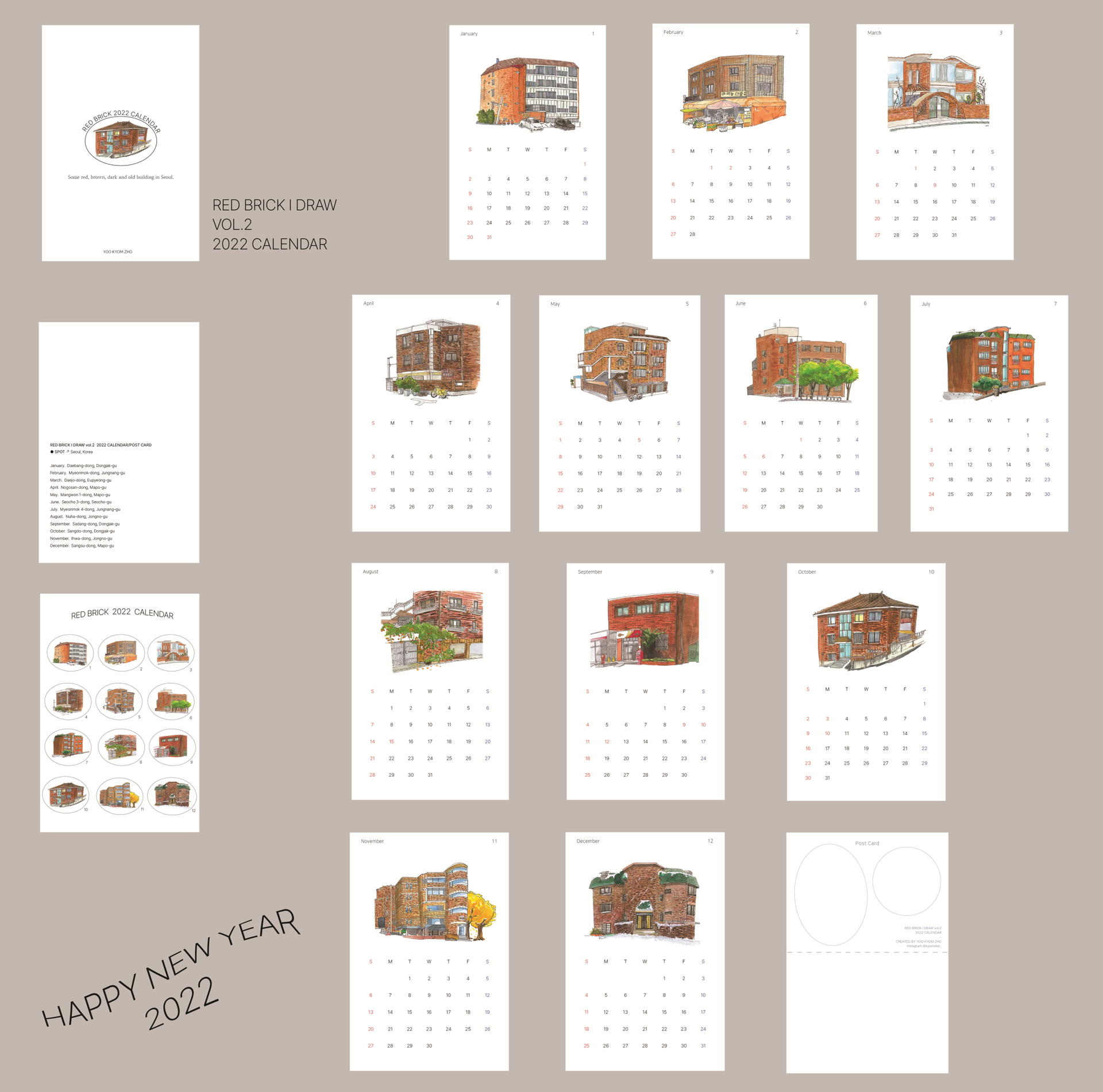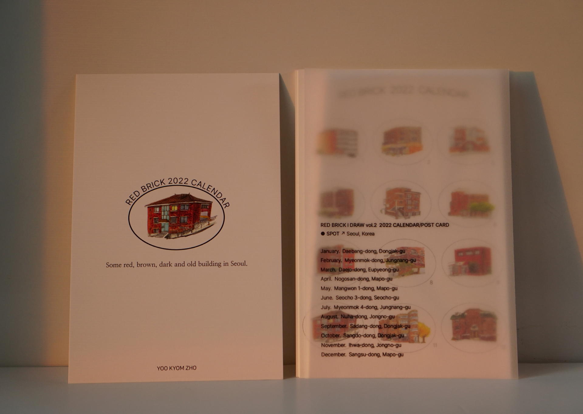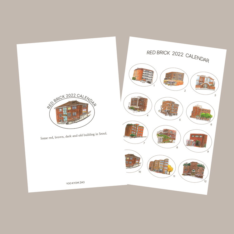 시간이 날 때 마다 서울의 거리들을 산책하며, 붉은 벽돌의 집들을 수집해 왔습니다. 그렇게 하나씩 모은 서울에 있는 벽돌 집 열두 곳을 수채화로 담았습니다. 일상 속에서 시선이 달력에 머문 잠깐 동안엔 계절마다 달라지는 그림을 통해 거리를 산책하는 기분을 느껴 보시길 바랍니다. 트레이싱지(간지)에는 서울 12곳의 위치가 기록되어있습니다. 달력은 낱장형태로 뒷장에는 자르는 선이 있어 자르고, 그림을 엽서로도 사용할 수 있도록 제작하였습니다.